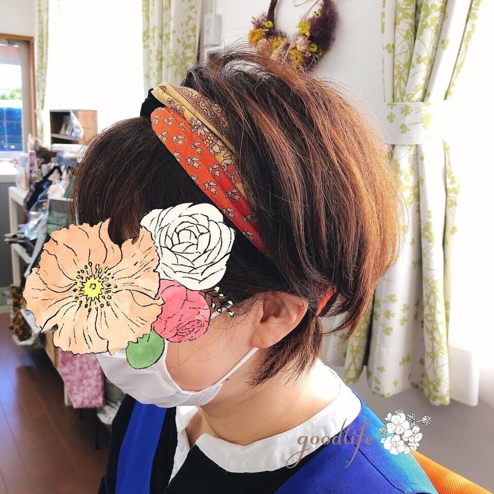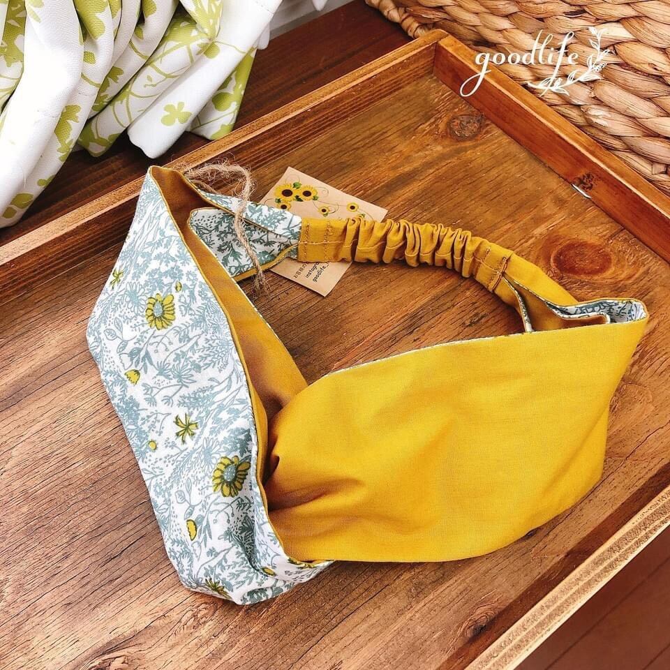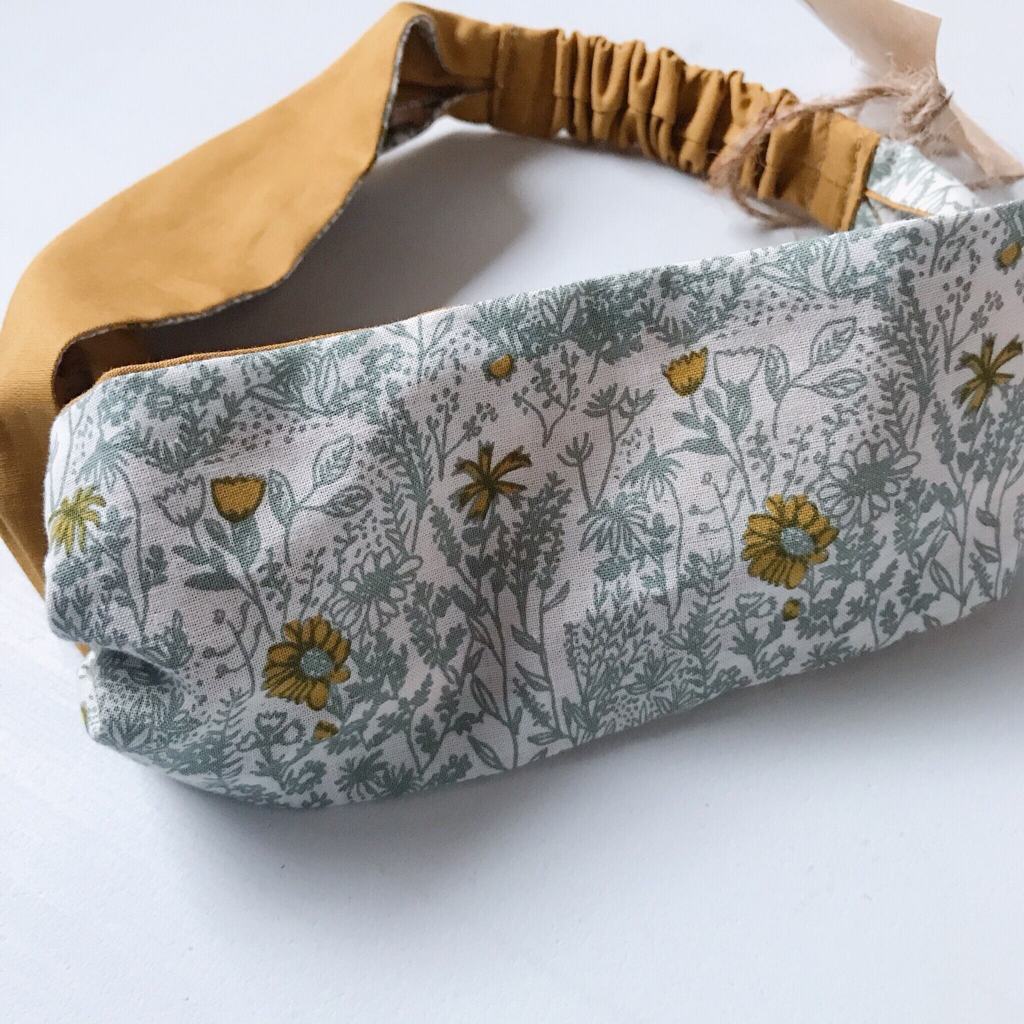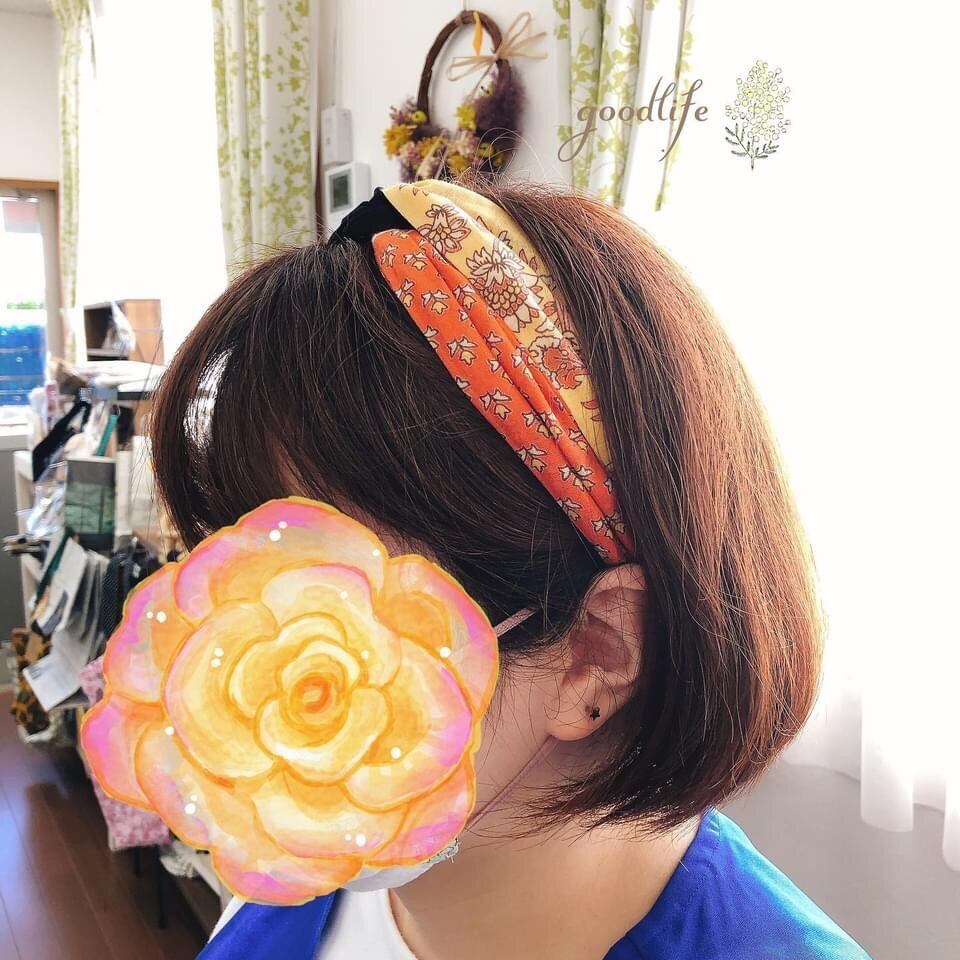 ヘアバンド ☆ クロスターバン グリーン花柄×マスタード 【オーダー】